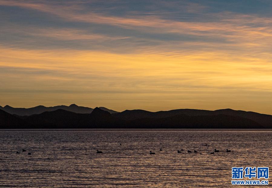 日落時分,水鳥在羊卓雍錯湖面上游曳(1月9日攝)。新華社記者 孫非 攝