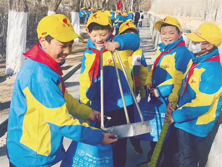 拉薩市城關區(qū)拉魯小學學生幫助環(huán)衛(wèi)工人清掃人行道