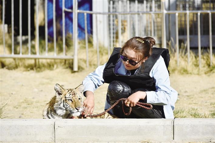 當(dāng)記者看到四只幼獅時,它們時而聚在一起,時而沿著籠子邊溜達(dá),時而張開大嘴向著外人示威,還有一個非常活躍的在攀爬籠子。小老虎次仁卓瑪雖然沒有兄弟姐妹的陪伴,不過園區(qū)的獸醫(yī)小姐姐成了它最貼心的玩伴。每天,獸醫(yī)小姐姐都會帶著次仁卓瑪進行戶外活動,次仁卓瑪像小朋友一樣喜歡玩皮球,喜歡追著獸醫(yī)小姐姐跑,還特別喜歡獸醫(yī)小姐姐給它按摩,經(jīng)常會撒嬌求抱抱。