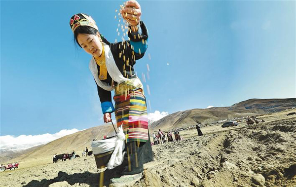 拉薩市墨竹工卡縣唐加鄉(xiāng)卓村四組群眾在田間撒下希望的種子。通訊員 洛??酥?記者 洛桑 攝