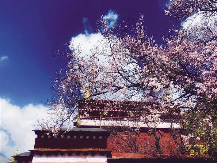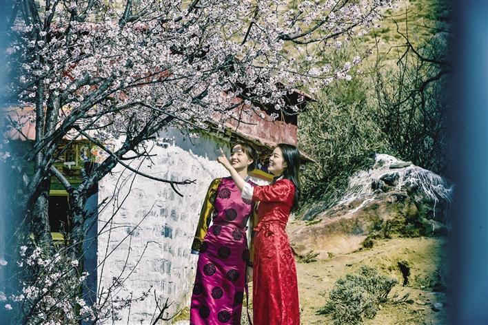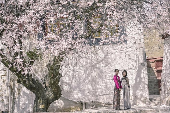 這里雖然沒(méi)有漫山遍野桃花次第盛開(kāi),但有花團(tuán)錦簇、桃紅柳綠,幾棵桃樹(shù),一陣春風(fēng)吹過(guò),花瓣如雨。身著藏裝的姑娘,與桃花合影,共赴春天的約會(huì),看上去頗有些妖嬈的味道。