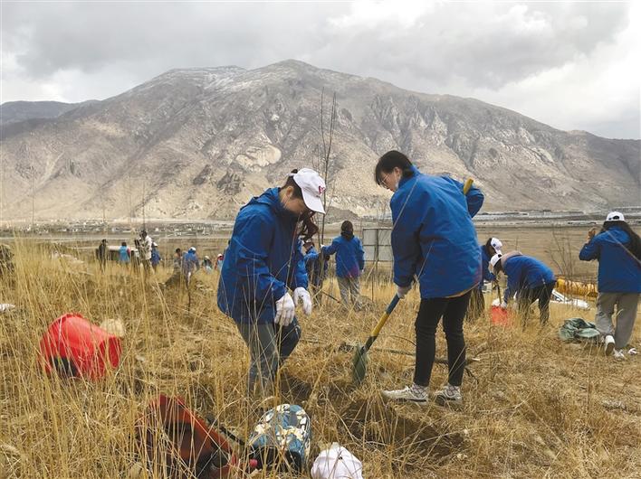 圖為青年志愿者在拉薩市堆龍德慶區(qū)“西藏青年志愿者林”義務(wù)植樹(shù)。次仁羅布 李洲 攝