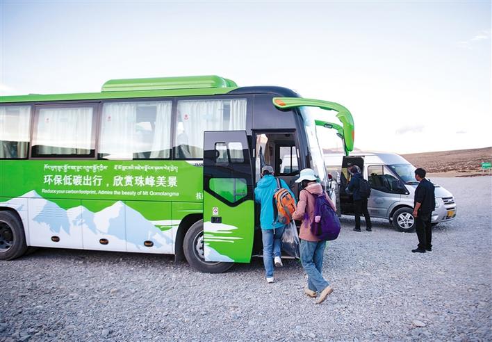 游客在珠穆朗瑪峰景區(qū)停車場轉(zhuǎn)乘環(huán)??蛙嚕?019年5月16日攝)。珠穆朗瑪峰景區(qū)內(nèi)自2019年5月開始試運營清潔能源環(huán)??蛙嚕赃M(jìn)一步平衡珠峰地區(qū)旅游發(fā)展與環(huán)境保護(hù)需要。新華社記者 孫非 攝