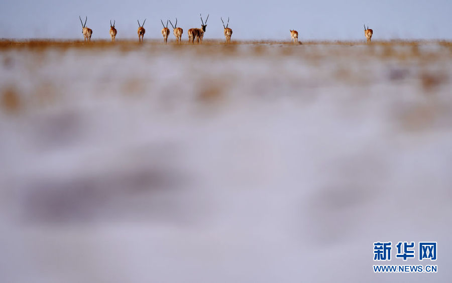 4月20日,一群藏羚羊向卓乃湖遷徙途中回望。新華社記者 吳剛 攝