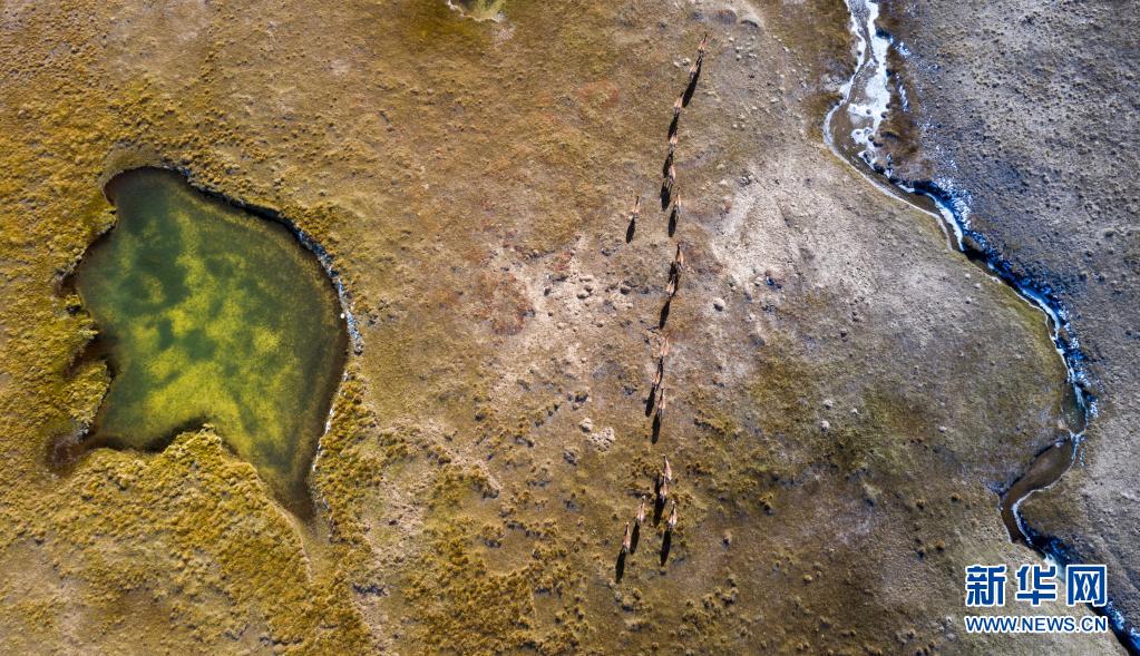 2019年10月19日,藏野驢在三江源地區(qū)活動(無人機照片)。新華社記者 吳剛 攝