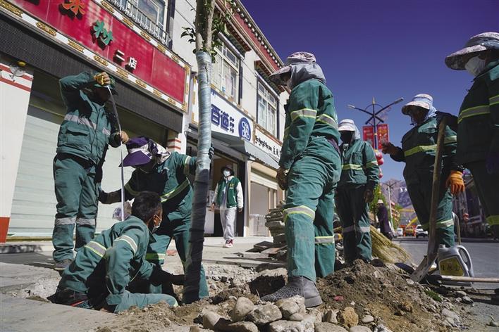 4月23日,記者在拉薩市朵森格路北段看到,道路兩旁正在栽種新樹木——大葉女貞。城關(guān)區(qū)潔達(dá)園林公司綠化二隊隊長達(dá)娃告訴記者,因為朵森格路北段兩邊的銀杏樹高度過高,影響商鋪招牌與監(jiān)控拍攝,所以要進(jìn)行移栽。