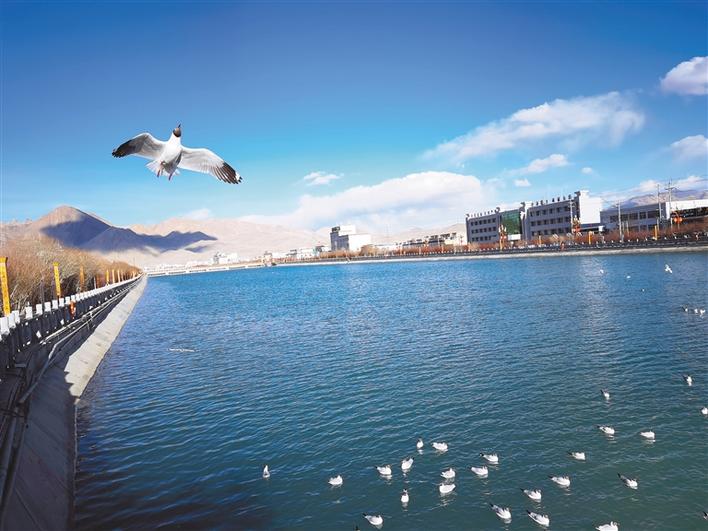 圖為阿里地區(qū)獅泉河畔,碧水藍(lán)天,候鳥飛翔。記者 史金茹 通訊員 王倆合 攝