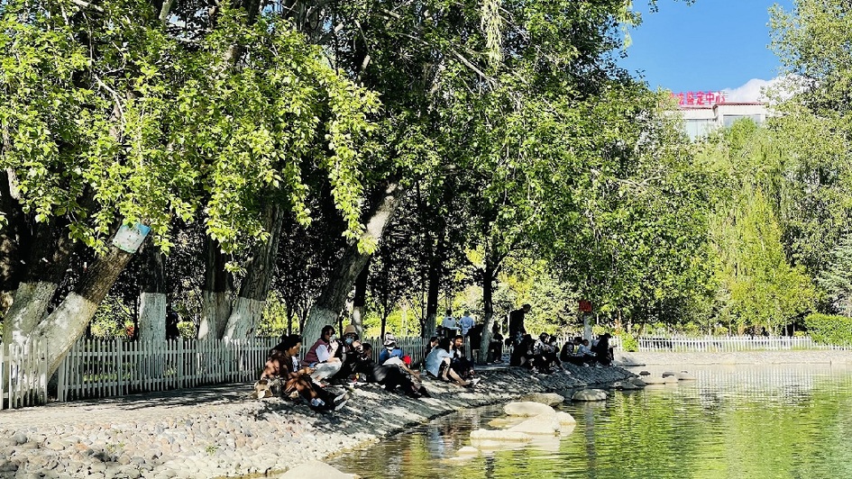 在宗角祿康公園湖邊納涼的市民和游客(6月14日攝)。 羅布曲珍 攝