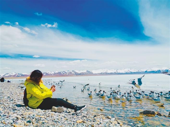 圖為游客在納木錯(cuò)邊拍攝紅嘴鷗。 記者 央金 攝