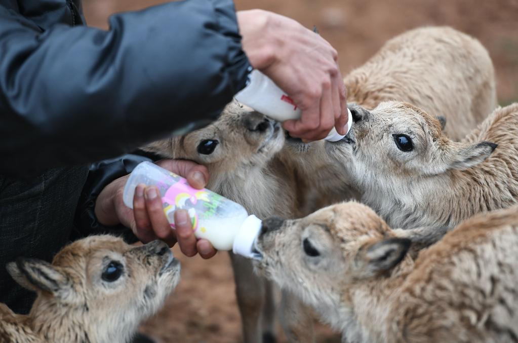2020年7月7日,三江源國家公園管理局長江源園區(qū)可可西里管理處卓乃湖保護站的工作人員在給藏羚羊幼仔喂奶。新華社記者 薛玉斌 攝