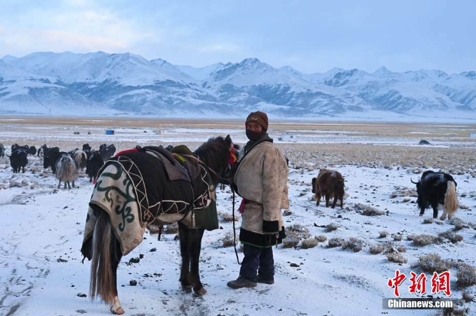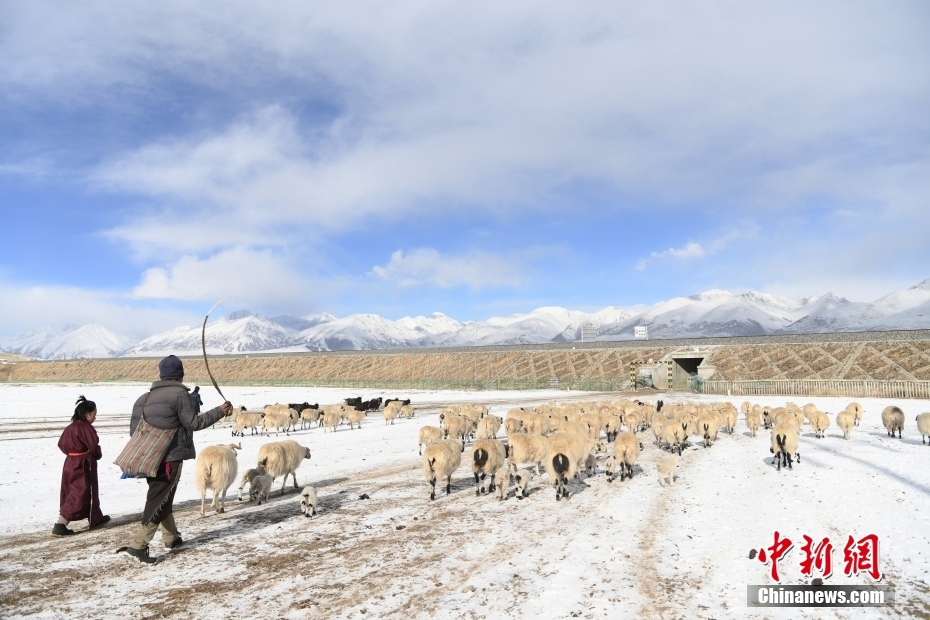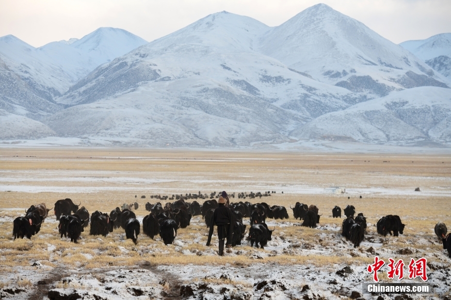 1月27日,當(dāng)雄縣龍仁鄉(xiāng)烏達(dá)村牧民在雪中放牧。當(dāng)雄縣位于西藏自治區(qū)拉薩市北部,距拉薩市區(qū)170公里?!爱?dāng)雄”,藏語意為“天選牧場”,平均海拔約4200米,草場廣闊,土地肥沃。 中新社記者 貢嘎來松 攝