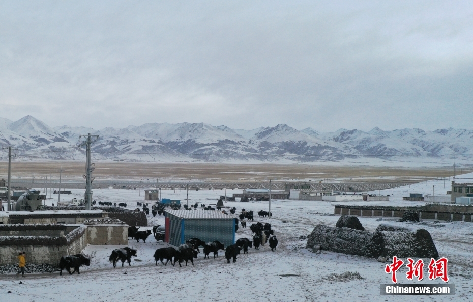 1月27日,當(dāng)雄縣龍仁鄉(xiāng)烏達(dá)村牧民在雪中放牧。當(dāng)雄縣位于西藏自治區(qū)拉薩市北部,距拉薩市區(qū)170公里?!爱?dāng)雄”,藏語意為“天選牧場”,平均海拔約4200米,草場廣闊,土地肥沃。(無人機(jī)照片) 中新社記者 貢嘎來松 攝