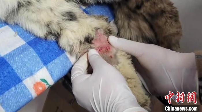 圖為雪豹右后腿受傷?!《继m縣融媒體中心 供圖