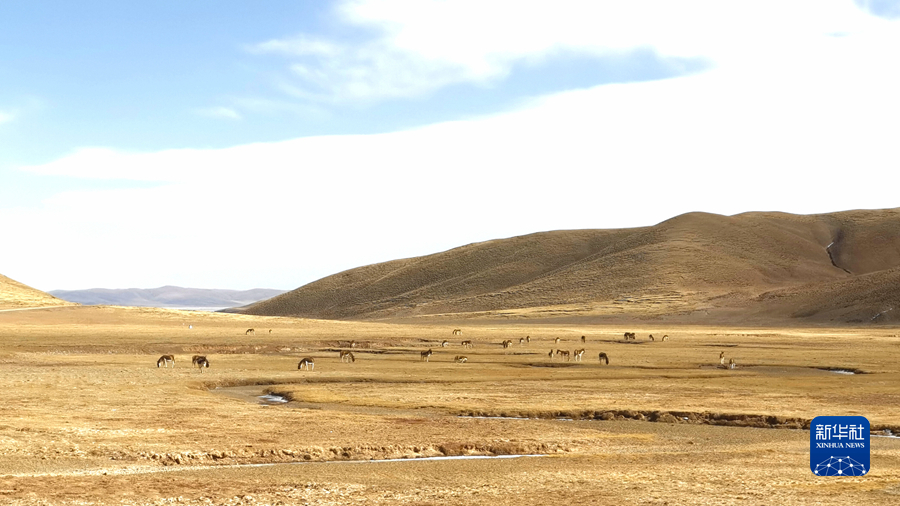 3月12日,在三江源國家公園黃河源園區(qū)內(nèi),一群藏野驢在草灘上吃草。新華社記者 呂雪莉 攝