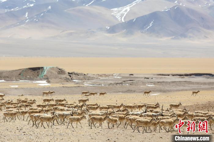 圖為3月27日,西藏阿里改則縣的藏羚羊群。 邊巴 攝