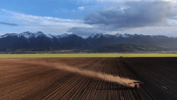 青海省三江集團(tuán)門源種馬場(chǎng)的工人駕駛農(nóng)機(jī)在油菜田里播種(無(wú)人機(jī)照片)。記者 張宏祥 攝