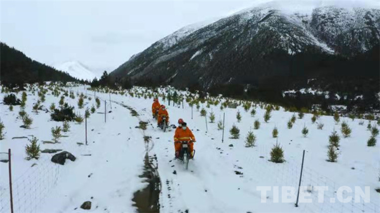圖為卓瑪朗措國家濕地公園濕地檢測員冒著風(fēng)雪巡邏