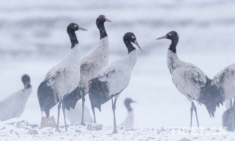 圖為在拉薩市林周縣虎頭山水庫(kù)附近越冬的黑頸鶴無(wú)憂(yōu)無(wú)慮地覓食 攝影:趙耀