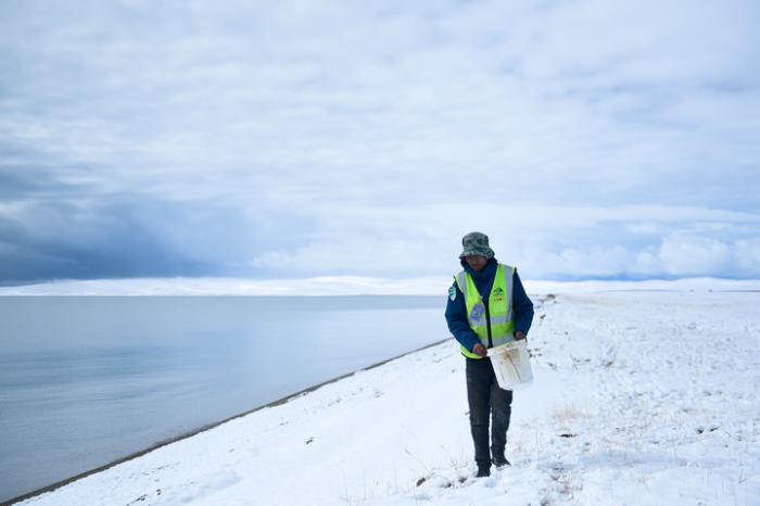 2021年10月,三江源國家公園黃河源園區(qū)生態(tài)管護(hù)員俄措在扎陵湖邊撿拾垃圾。新華社記者張龍攝