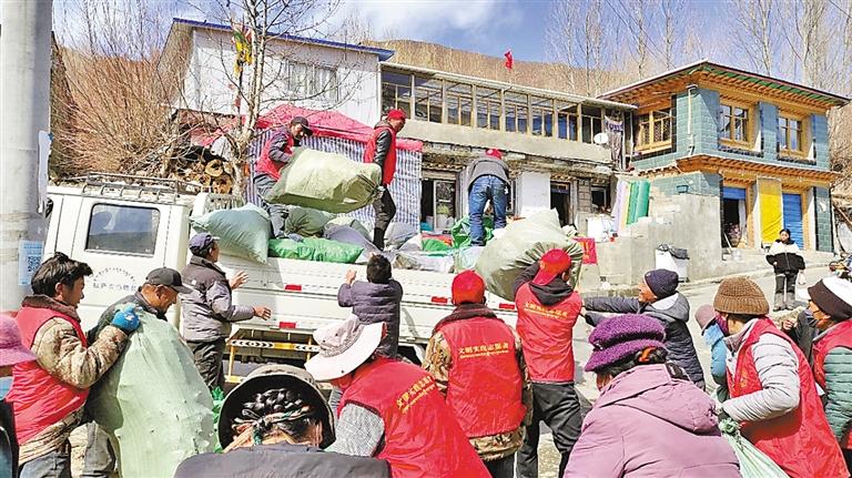 圖為朗縣登木鄉(xiāng)新時(shí)代文明實(shí)踐志愿者將清理出來(lái)的垃圾裝車。記者 史金茹 攝