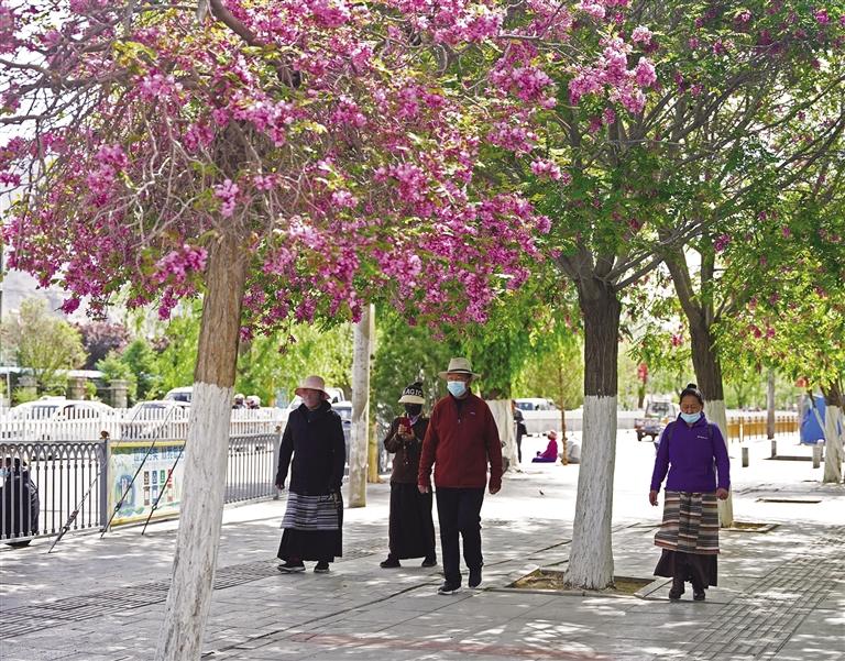如今,走在市區(qū)街頭或公園,隨處可以看到開花的樹種,有的已經(jīng)凋零,有的開得正艷,有的含苞待放。在布達(dá)拉宮腳下的北京中路道路兩側(cè)櫻花全面盛開,粉紅色的櫻花宛如云霞,花瓣隨著微風(fēng)簌簌落下,煞是浪漫。將初夏的北京中路裝扮成一幅美麗的畫卷,吸引許多市民和游客賞花拍照。