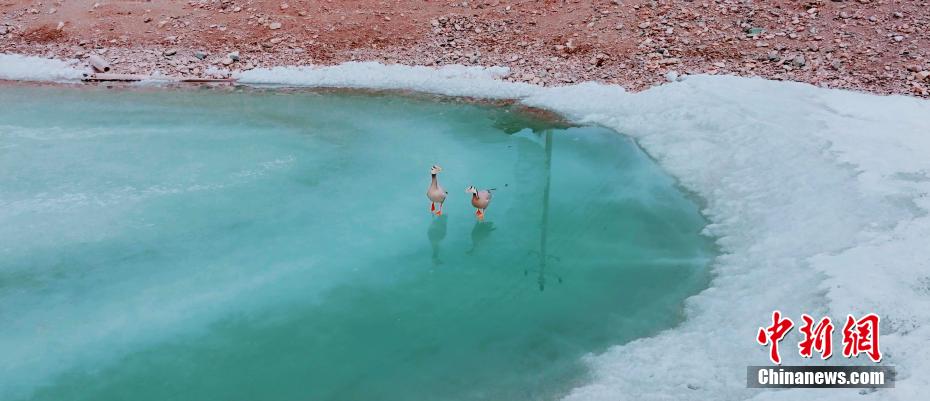 立夏以來,在位于祁連山國家公園內(nèi)的青海省海北藏族自治州祁連縣,當(dāng)?shù)孛癖娕臄z到多種野生動物活動影像。圖為斑頭雁在冰面行走。