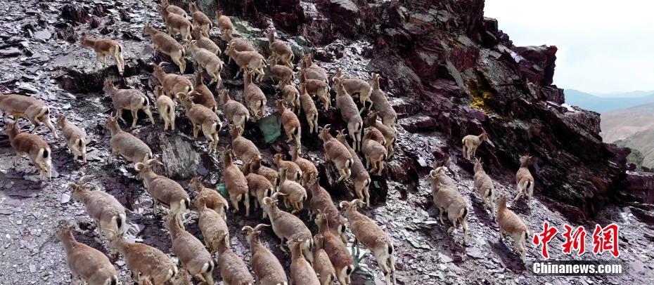 在青藏高原,春夏季氣溫較東部地區(qū)低,由于海拔較高,祁連山頂積雪常年不化。雖然近日降溫,但野生動物已感受到夏日來臨。圖為正在爬山的巖羊群。 馬志原 攝