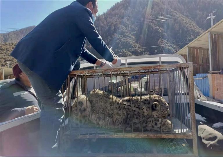 圖為工作人員將雪豹運(yùn)送至林芝市野生動(dòng)物收容救護(hù)站。 (西藏自治區(qū)林業(yè)和草原局提供)