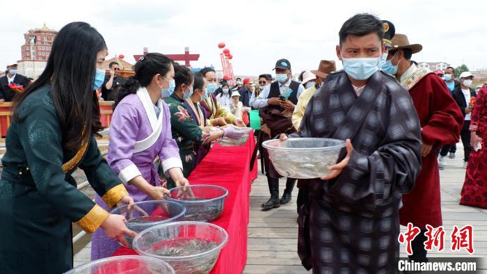 圖為民眾增殖放流青海湖裸鯉?!±铍h 攝