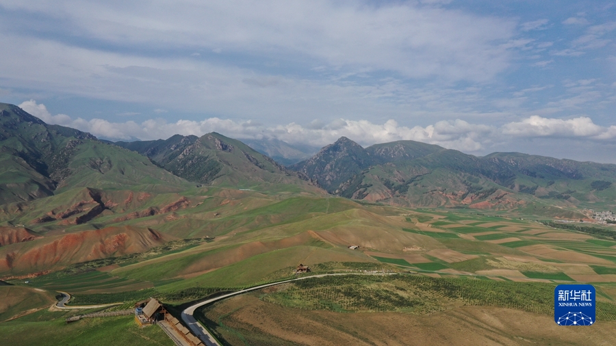 這是6月19日在祁連縣拍攝的祁連山支脈卓爾山美景(無(wú)人機(jī)照片)。新華社記者 李占軼 攝
