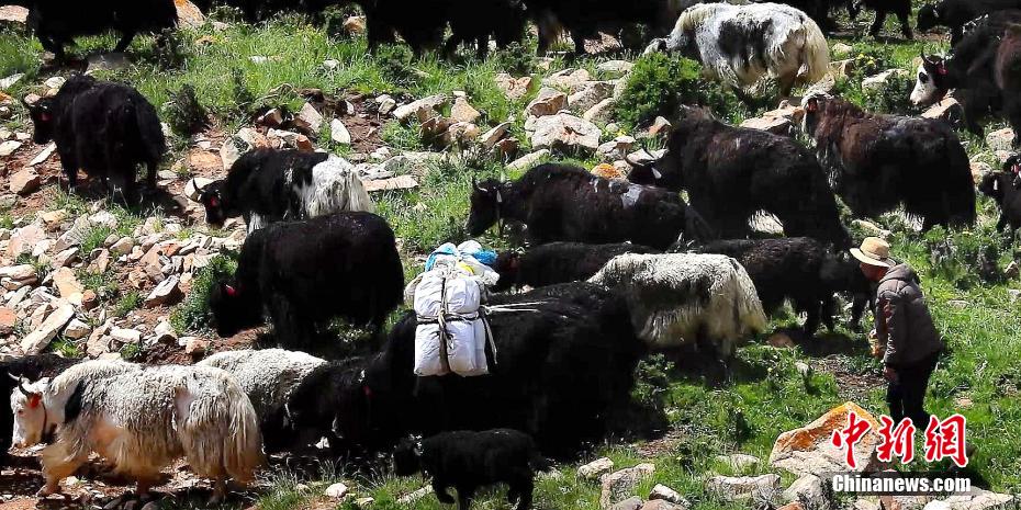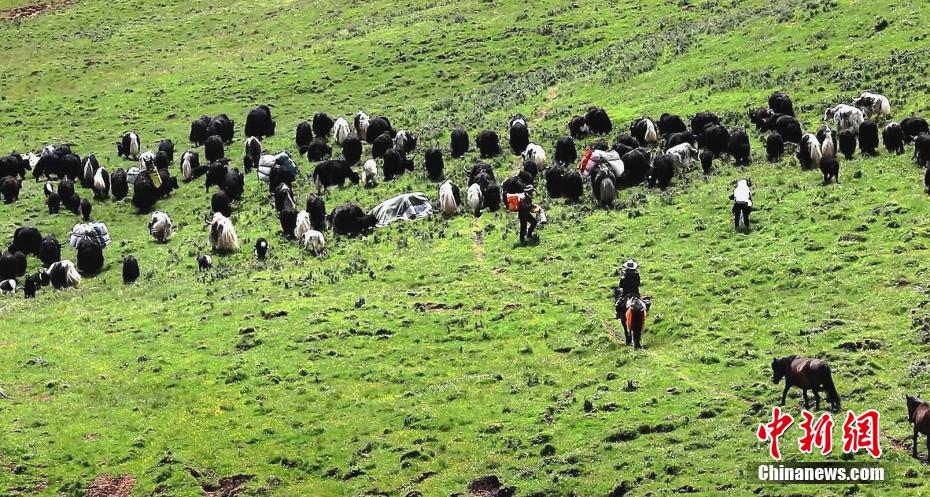 圖為牧民讓牦牛背上“行李”轉(zhuǎn)場(chǎng)。 仁青多杰 攝