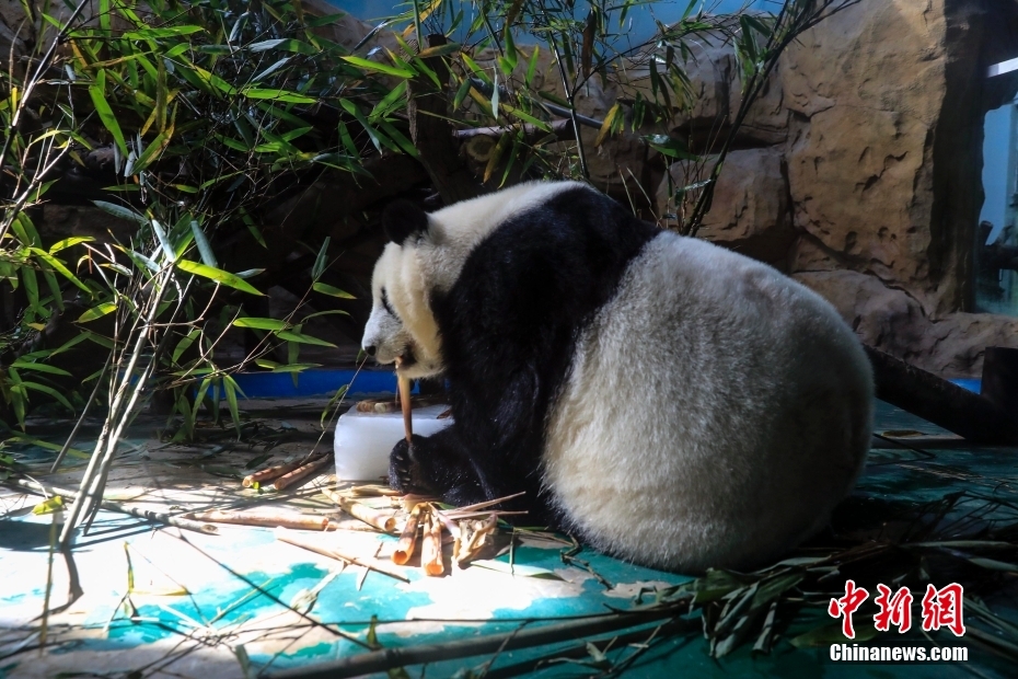7月6日,四川成都動物園,一只大熊貓?jiān)诒鶋K旁吃竹筍。當(dāng)日,成都市高溫天氣持續(xù)。 [詳細(xì)] -