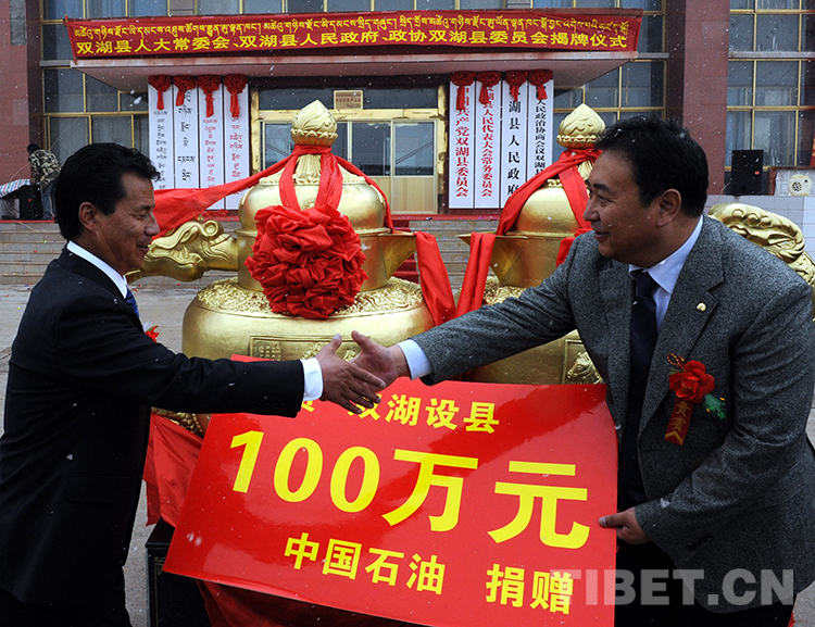 這是對口援助單位的中國石油為雙湖設縣捐贈100萬元。經國務院批準,2013年7月26日,雙湖特別區(qū)“撤區(qū)建縣”正式掛牌(唐召明2013年7月26日攝)