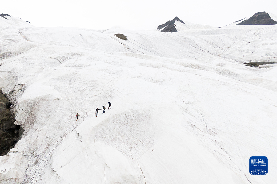 7月28日,來自長江科學(xué)院的科考隊員在長江源格拉丹東雪山上(無人機(jī)照片)。新華社記者肖藝九 攝