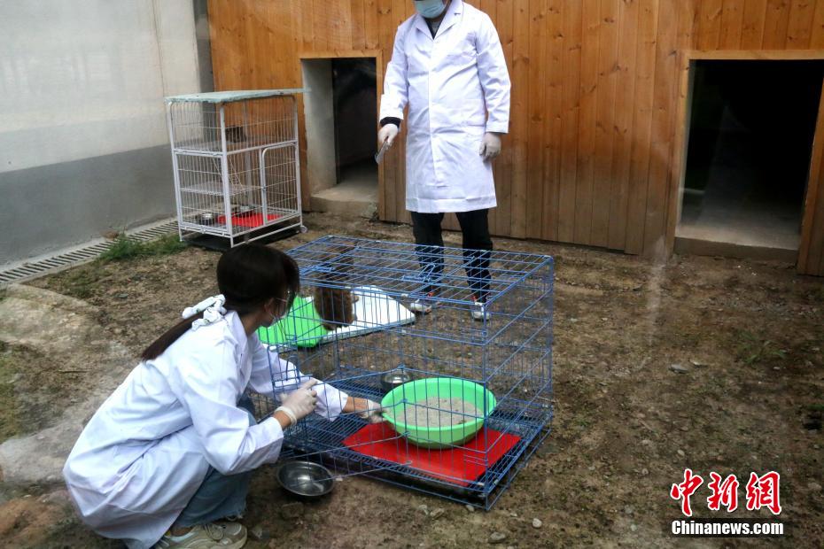 圖為“奶爸”“奶媽”給國家一級(jí)重點(diǎn)保護(hù)野生動(dòng)物荒漠貓換貓砂。 張?zhí)砀?攝