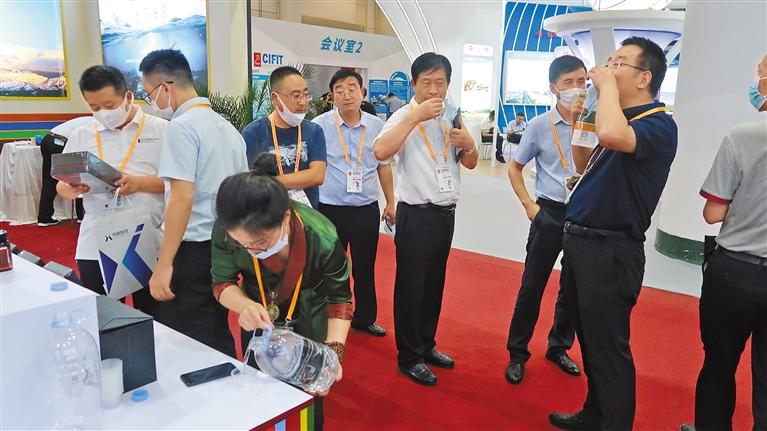 近年來(lái),西藏加快發(fā)展飲用水產(chǎn)業(yè),積極拓展飲用水產(chǎn)品銷售渠道,在區(qū)內(nèi)外各種展覽會(huì)、展銷會(huì)、博覽會(huì)上大力推銷水產(chǎn)品。 圖為2020廈門國(guó)際投資貿(mào)易洽談會(huì)暨絲路投資大會(huì)上,與會(huì)者在展示展銷會(huì)現(xiàn)場(chǎng)品鑒西藏“地球第三極”產(chǎn)業(yè)發(fā)展有限公司生產(chǎn)的天然飲用水產(chǎn)品。(資料圖片)記者 王超 攝