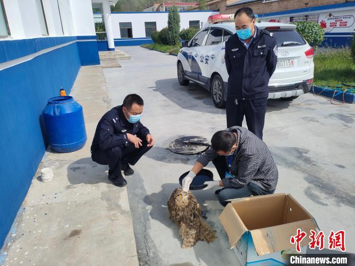 圖為民警正在檢查國(guó)家二級(jí)保護(hù)野生動(dòng)物雕鸮受傷情況?!』ブ补﹫D