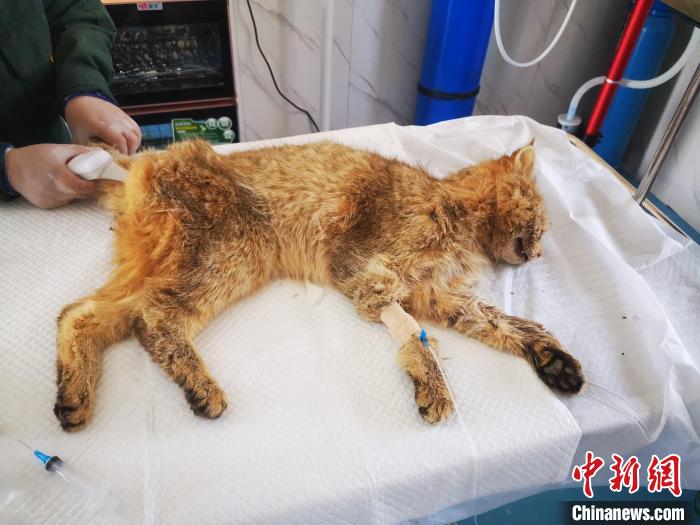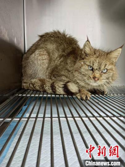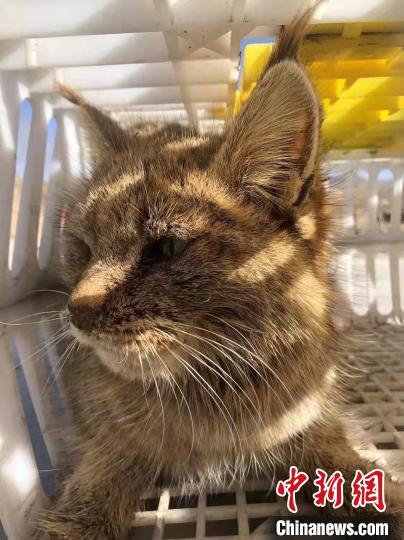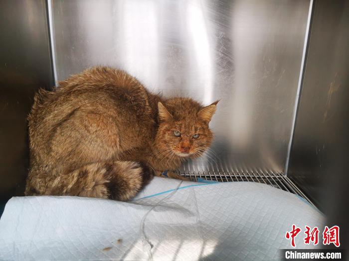 圖為被救護(hù)的荒漠貓“黃老太”?!∏嗪R吧鷦?dòng)物救護(hù)繁育中心供圖