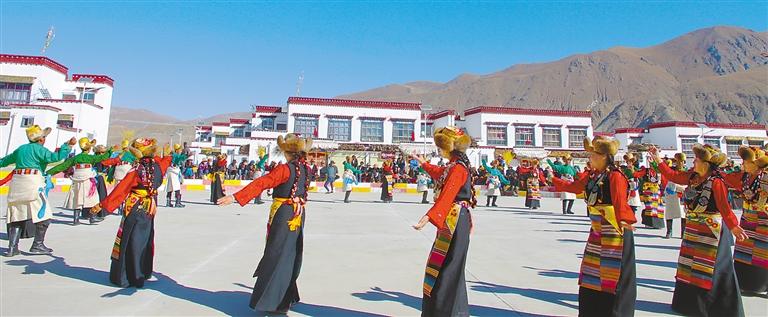 文藝事業(yè)繁榮興盛,全區(qū)共有10個(gè)專業(yè)文藝團(tuán)體、76個(gè)縣區(qū)藝術(shù)團(tuán)、153個(gè)民間藏戲隊(duì)、395個(gè)鄉(xiāng)鎮(zhèn)文藝演出隊(duì),所有行政村成立群眾文藝演出隊(duì)。圖為西藏自治區(qū)扎囊縣德吉新村群眾文藝演出隊(duì)開(kāi)展演出活動(dòng)。
