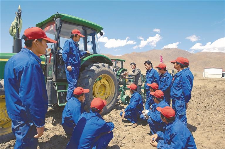 發(fā)展教育脫貧一批。2016年以來(lái),累計(jì)落實(shí)義務(wù)教育學(xué)?;窘ㄔO(shè)資金84.4億元,實(shí)施教育基礎(chǔ)建設(shè)項(xiàng)目1433個(gè),資助建檔立卡和農(nóng)村低保大學(xué)生累計(jì)6.06萬(wàn)人次,落實(shí)資助資金3.55億元。圖為西藏自治區(qū)白朗縣邀請(qǐng)山東農(nóng)機(jī)技師對(duì)當(dāng)?shù)刎毨糸_(kāi)展培訓(xùn)。