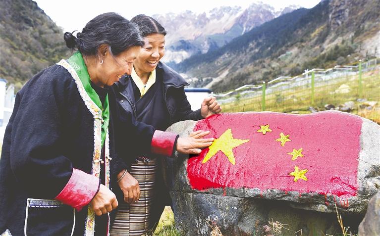 圖為“家是玉麥,國(guó)是中國(guó)”,人人爭(zhēng)做神圣國(guó)土守護(hù)者、幸福家園建設(shè)者。圖為“七一勛章”獲得者卓嘎和同為“時(shí)代楷?!钡拿妹醚胱诘诌呇策?。