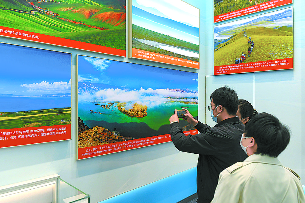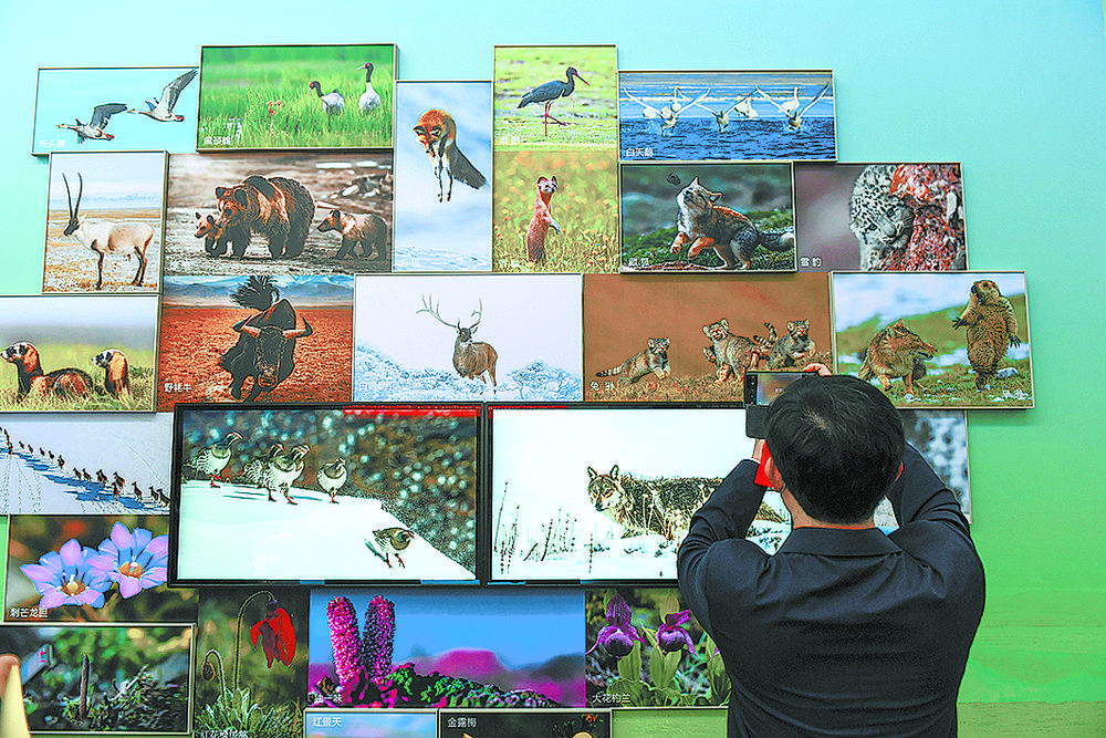 雪豹、兔猻、黑頸鶴、馬麝、廣布紅門蘭、水母雪兔子、紅花綠絨蒿……青海特有的動植物照片墻吸引觀眾駐足,珍稀動物的生活智慧和罕見植物的生長歷程通過攝影師的鏡頭,向世界展示了青海生物多樣性保護取得的顯著成就。