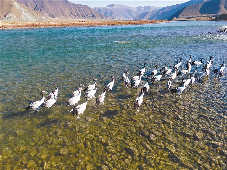 圖為11月5日下午,一群黑頸鶴在墨竹工卡縣唐加鄉(xiāng)段水域覓食。通訊員 洛克 攝