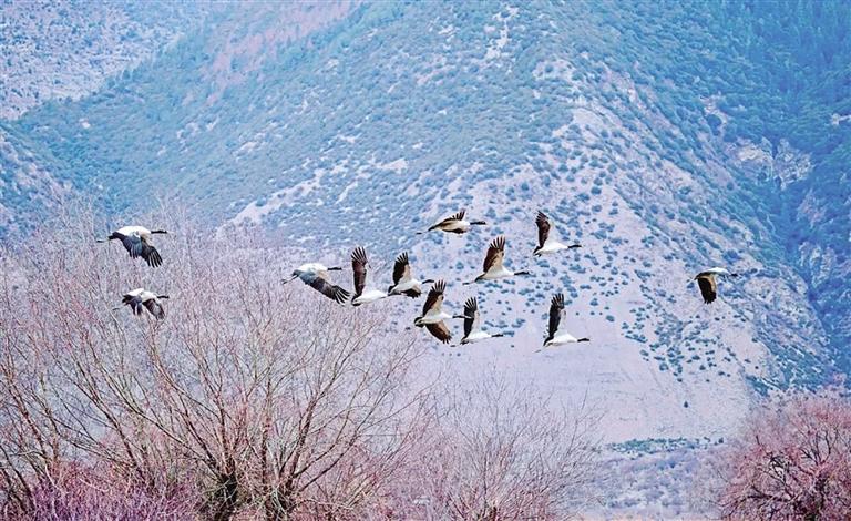 黑頸鶴是世界上唯一生長、繁殖在高原的鶴類,通?;顒佑诤0?000米以上的開闊農(nóng)田、河谷和濕地,屬國家一級保護動物,林芝是黑頸鶴的重要棲息地之一。據(jù)北京林業(yè)大學郭玉民教授團隊跟蹤監(jiān)測,10月30日以來,今年首批黑頸鶴順利從青海湖附近繁殖地返回林芝越冬地,遷徙直線距離超過1100公里。