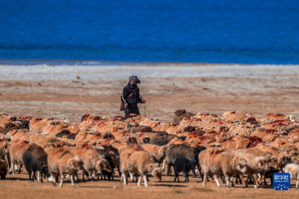牧民在羊卓雍錯(cuò)湖邊放羊(12月11日攝)。新華社記者 姜帆 攝