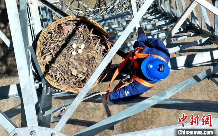 圖為國網(wǎng)青海省電力公司工作人員正在檢查人工鳥巢的情況?!W(wǎng)青海省電力公司供圖
