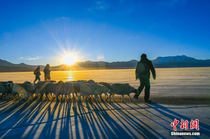 這個邊境小村3日迎來了一年一度的“趕羊”盛事。村民們將1400余只羊由岸邊通過厚實(shí)的冰面趕往湖心島牧場。普姆雍措被稱為“仙女之淚”,位于西藏山南市浪卡子縣,每到冬季極寒時,便是羊群轉(zhuǎn)牧場的好時機(jī)。
