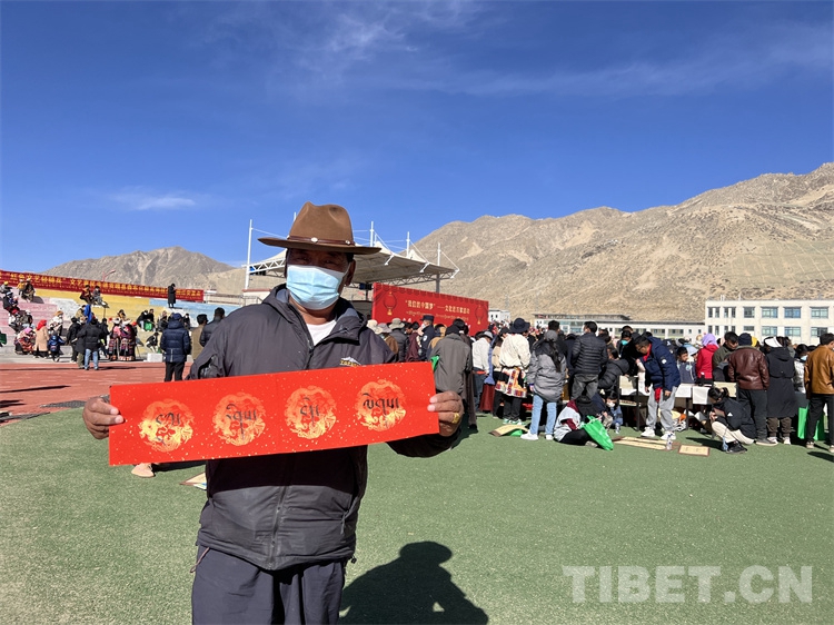 “我來自那曲安多縣,在森布日生活已有近一年,這里氣候暖,基礎(chǔ)設(shè)施齊全,真是趕上了好政策”66歲的多布杰說,他還主動拿起書法家現(xiàn)場書寫并贈送給他的吉祥對聯(lián)說:“今天真是很開心,觀看了一場精彩的節(jié)目,還得到了書法家寫的‘扎西德勒’吉祥對聯(lián),這個我要貼在家里的門窗上”。