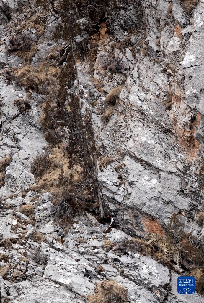 2月21日,在青海省玉樹藏族自治州雜多縣昂賽鄉(xiāng)境內(nèi)的昂賽大峽谷內(nèi),一只雪豹在向上攀爬。新華社記者 費(fèi)茂華 攝