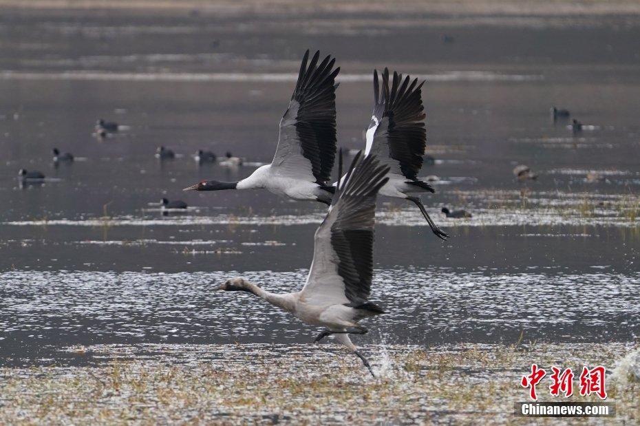 2月21日,黑頸鶴在納帕海展翅起飛。中新社記者 劉冉陽(yáng) 攝